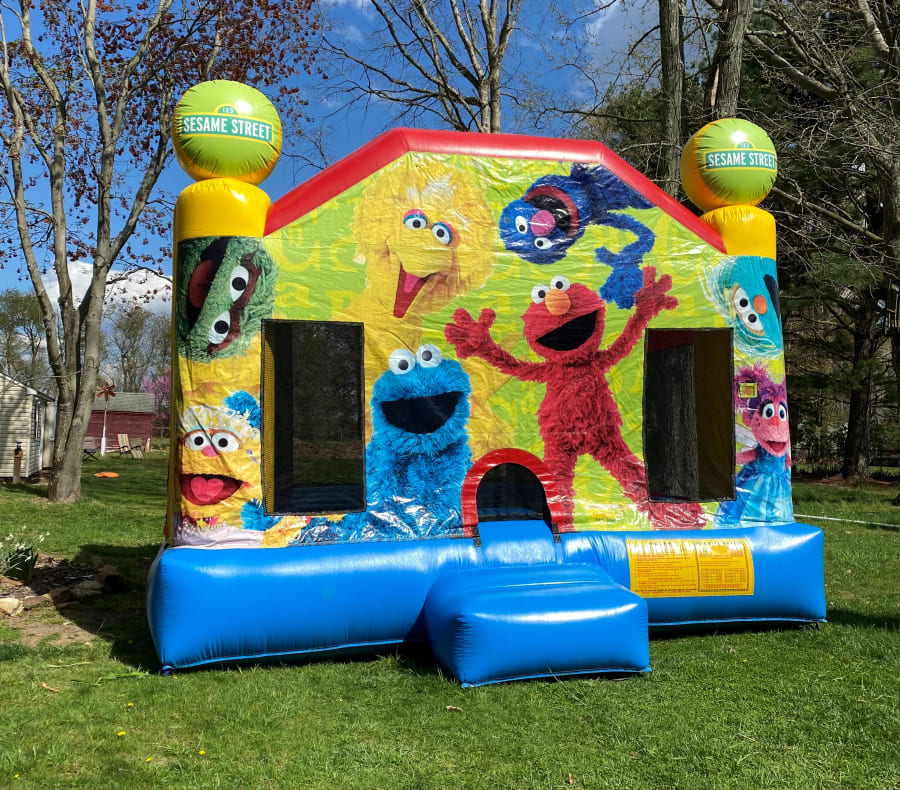 Looking for Sesame Street? Well you've found it, the perfect bounce house rental for all those monster lovers. The front of this bounce house features, Elmo, Cookie Monster, Big Bird, Abby Cadabby, Grover, Oscar, Zoe, and Rosita. All of our inflatables are made with the highest grade material, so it can be enjoyed by kids and adults alike! Guests are able to photograph all the fun jumping, with the safety mesh sides and back. The sesame Street bounce house rental is full of bright colors that will definitely be a center of attention, especially for the birthday child. Don't forget to checkout our Characters page to have the whole gang at your next party. Happy Jumping!