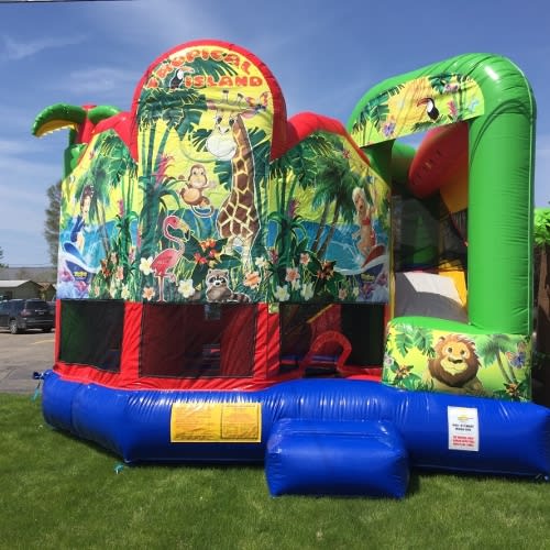Create a tropical atmosphere right in your own backyard with our Tropical 5in1 combo bounce house rental. Great for tiki parties, dinosaur parties and more!