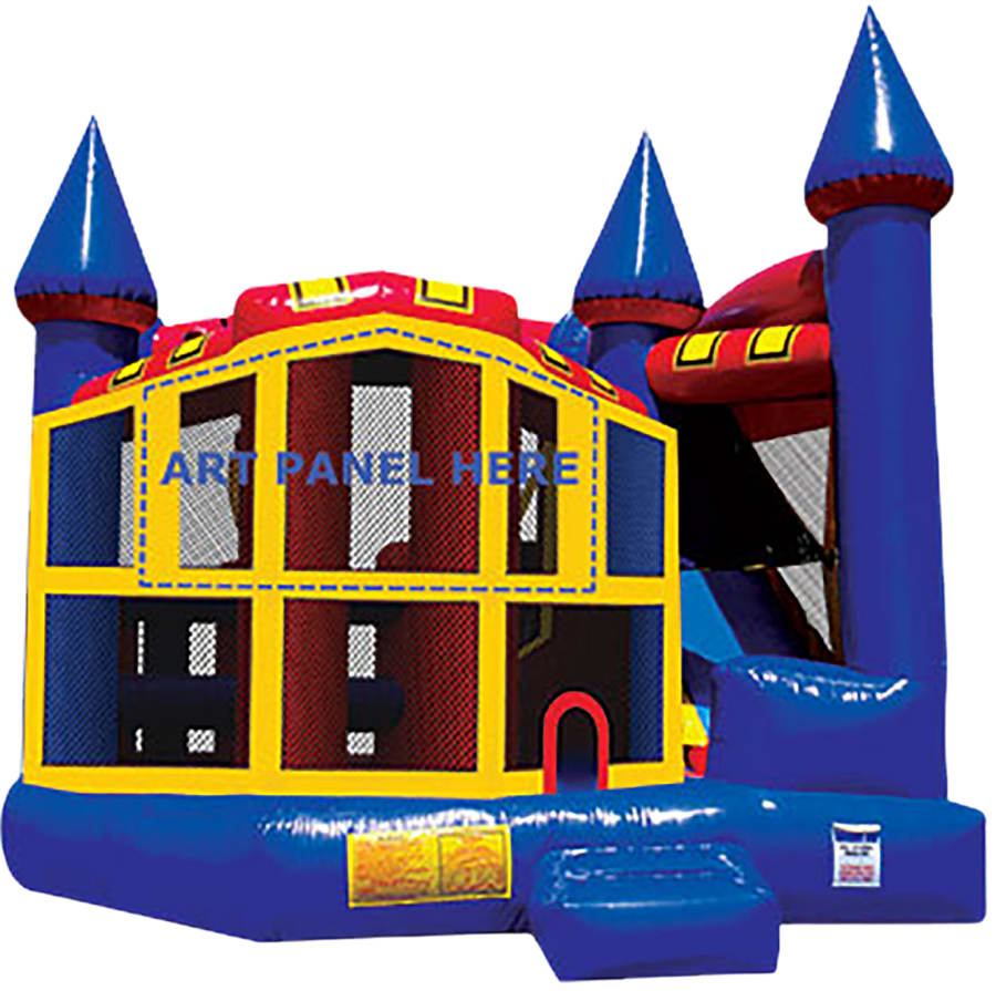 Need a way to keep your guest jumping for hours? With 5 different features wrapped in one inflatable bounce house, the 5in1 combo is the way to go! This moon bounce includes a jumping area, basketball hoop, climbing ladder, water slide, and both log and pop-up style obstacles. Each of our inflatables are built with top quality materials, which means people of all ages are allowed to join in on the fun. Happy jumping!