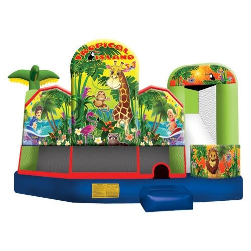 Bring the tropical paradise right to your backyard with our themed 5in1 combo bounce house rental. This Combo bounce house has everything from a jumping area and obstacle course, to a basketball hoop and slide. There is also one special feature of this tropical unit that will add even more fun. The slide can actually be turned into a water slide to help your guests cool off on those hot summer days. So just sit back and relax like a day on the beach, and let this water unit keep your guests entertained for hours of non-stop fun! Happy Jumping!